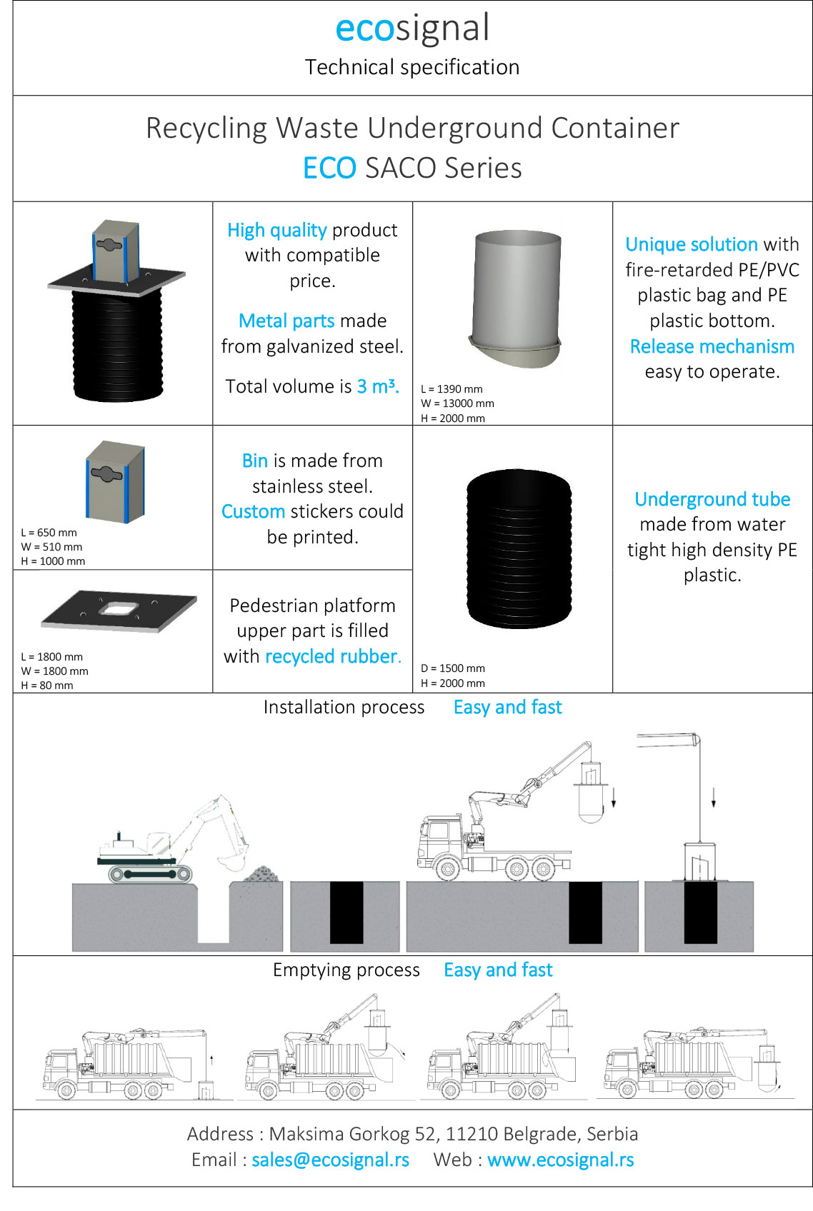 Eco Saco underground waste container series represent recycling solution with underground bag for waste collecting, made from fireproof material. This product doesn’t require any kind of locking mechanism, making its emptying process easy and fast.